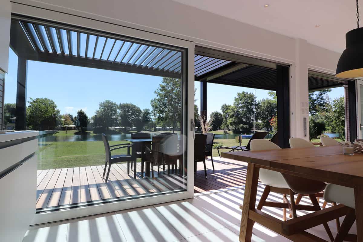 Die komplette Verglasung von Wohn-, Ess- und Küchenbereich zur Terrasse hin, lassen die Räume hell und sehr freundlich erscheinen. Elternschlafzimmer mit integriertem Duschbad, dazu Toilette und Sauna. Die großzügige Sonnenterrasse verfügt über ein regendichtes Lamellendach, falls das Wetter doch mal schlechter wäre. Der Wäscheservice ist in unserem Premium-Ferienhaus inklusive.
